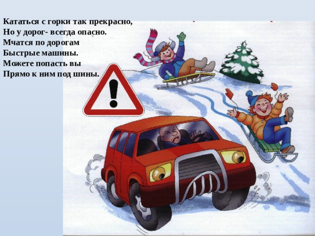 — Не устраивать игры и не кататься на коньках, лыжах и на санках с горок на проезжей части улицы.